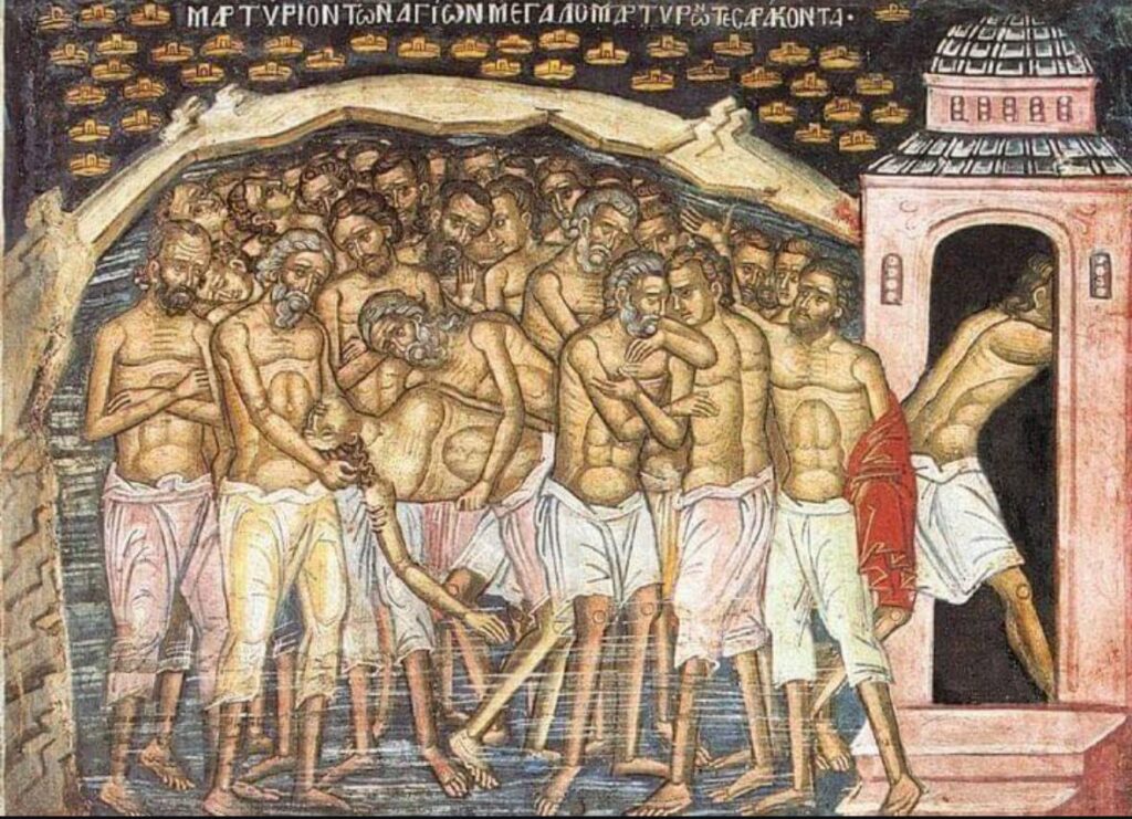У місті Севастії (Вірменія) було військо з сорока християнських легіонерів. Сорок севастійців відмовилися виконати наказ принести жертву ідолам і мучеників за віру роздягненими повели до озера. Святих залишили в крижаній воді на всю ніч, а на березі озера розтопили лазню. Через деякий час один з воїнів не витримав холоду, побіг до лазні, але тут же помер.