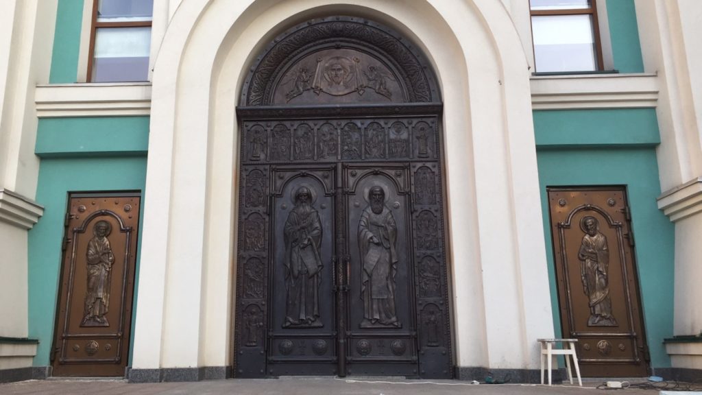 Центральні двері до собору в своєму роді унікальні. На них зображаються святі преподобні отці Антоній та Феодосій – засновники та перші насельники Києво-Печерського монастиря, ченці які принесли на Київські землі древню традицію церковного уставу. Навколо них зображаються ікони двунадесятих свят – особливо шанованих подій з життя Іісуса Христа, Богородиці та апостолів.