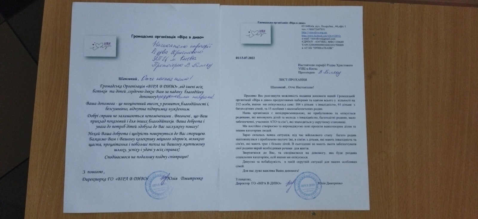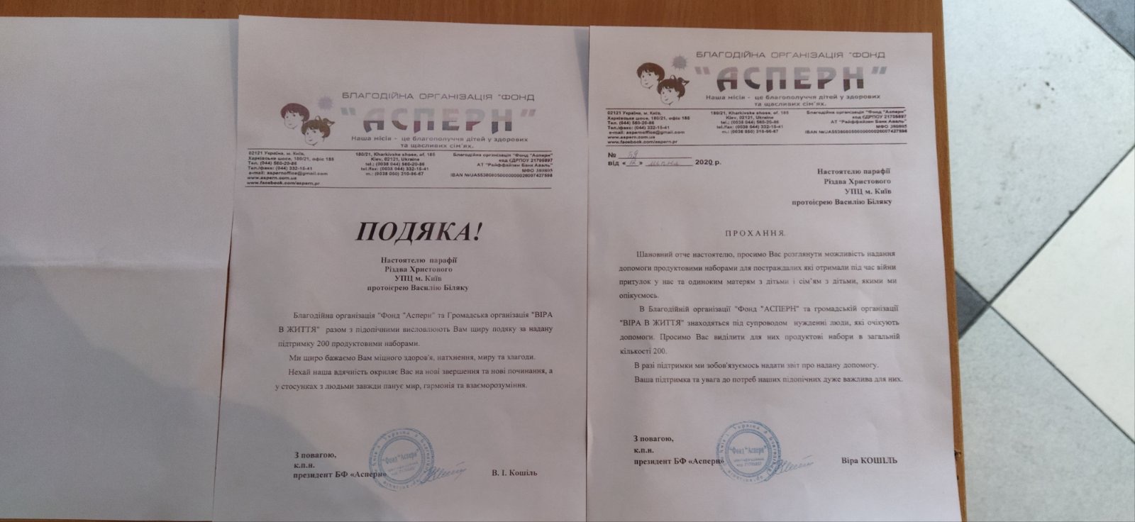 З Божою допомогою, за сприяння настоятеля та благодійників парафія вкотре посильно забезпечила продуктами харчування благодійні організації «Віра в диво» та «Асперн».