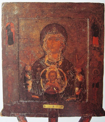 Богородица также представлена в молении, но здесь на ее груди присутствует изображение Христа-Младенца, заключенное в круг. Этот круг восходит к так называемым «imago clipeata»(лат. – портрет в раме), официальным портретам римских императоров, наличие которых на воинских знаменах и в присутственных местах символизировало незримое присутствие Императора и повсеместность его власти. У нас наиболее известны и почитаемы иконы «Великая Панагия. Ярославская» и, собственно, «Знамение. Новгородская».