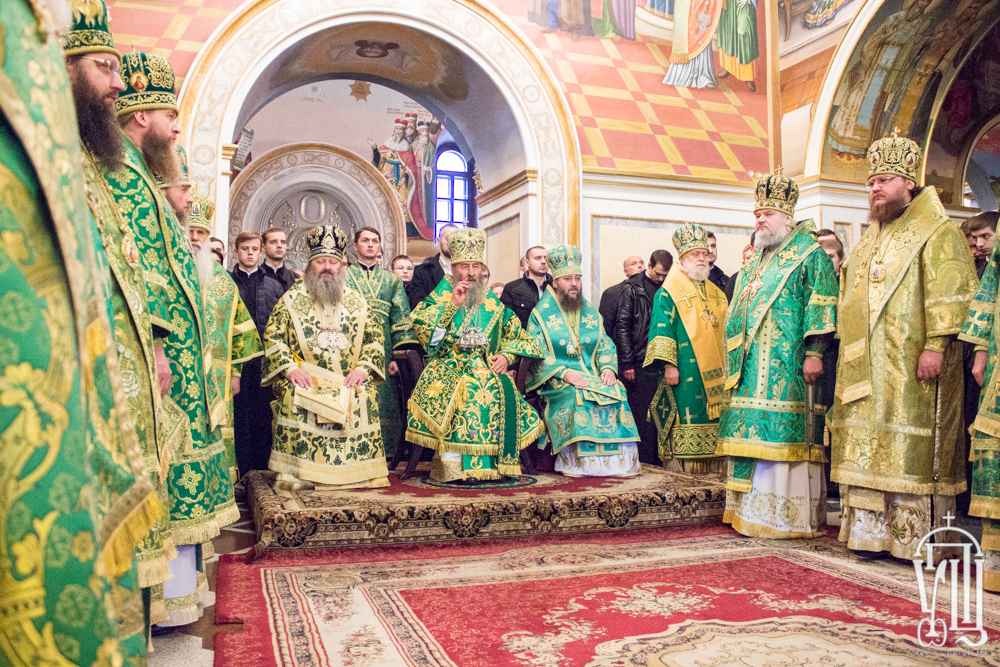 Його Блаженству за святковим богослужінням співслужили намісник обителі митрополит Вишгородський і Чорнобильський Павел, ректор КДАіС, керуючий справами УПЦ митрополит Бориспільський і Броварський Антоній, митрополит Запорізький і Мелітопольский Лука, митрополит Чернігівський і Новгород-Сіверський Амвросій, архієпископи: ректор МДАіС, голова Учбового комітету Руської Православної Церкви Верейський Євгеній, Бучанський Пантелеімон, Кіровоградський і Новомиргородський Іоасаф, Ровеньківський і Свердловський Пантелеімон; єпископи: Боярський Феодосій, голова Учбового комітету УПЦ Ірпінський Климент, Бородянський Варсонофій, Фастівський Даміан, Вознесенський і Первомайський Олексій, Васильківський Миколай, Новосанжарський Веніамін, а також викладачі, вихованці та гості Київських духовних шкіл у священному сані.