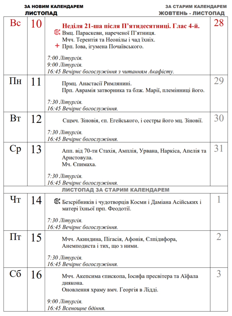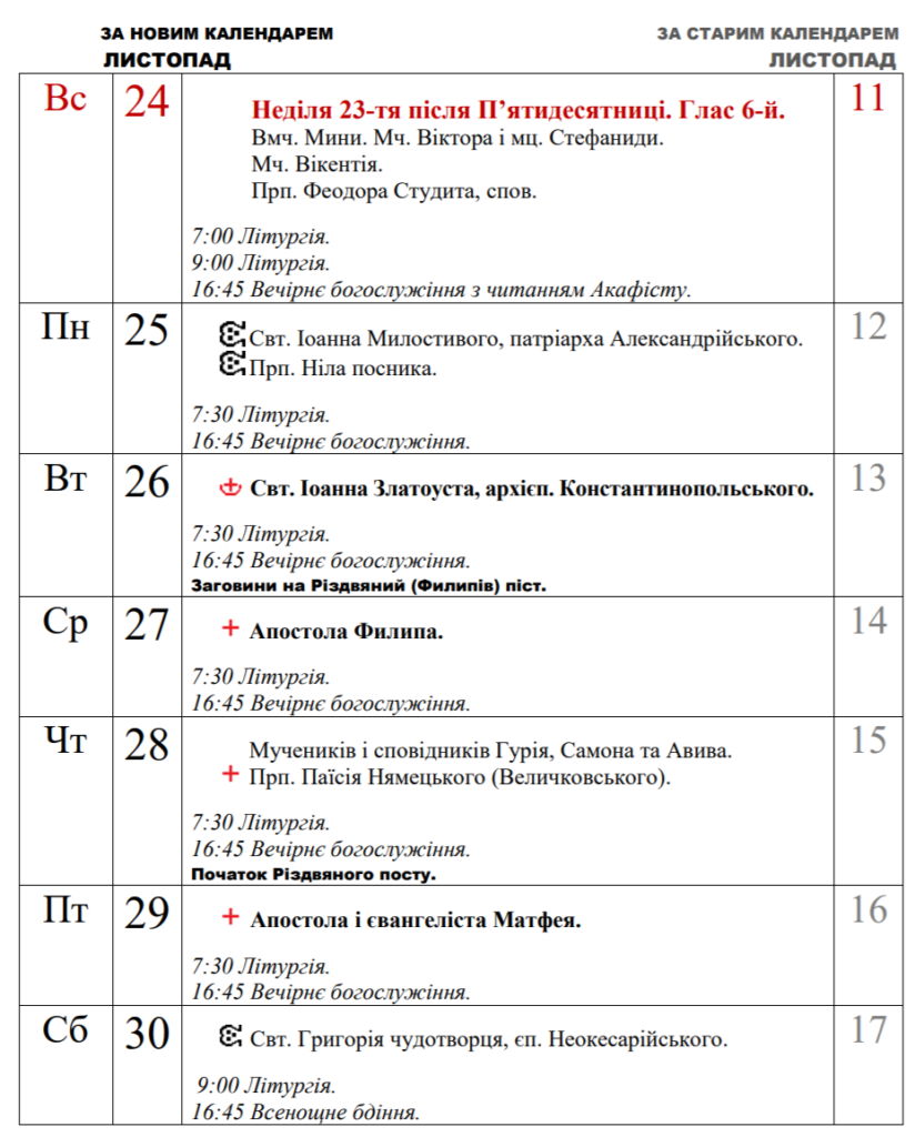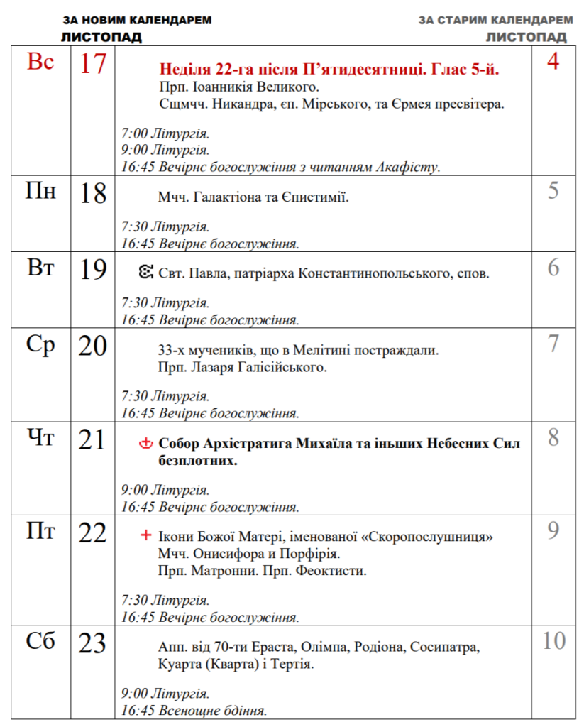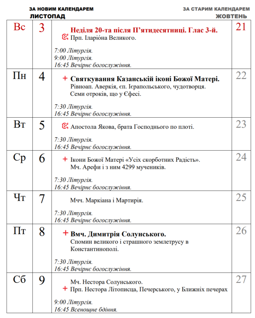 Публікуємо розклад богослужінь у нашому храмі у Листопаді.