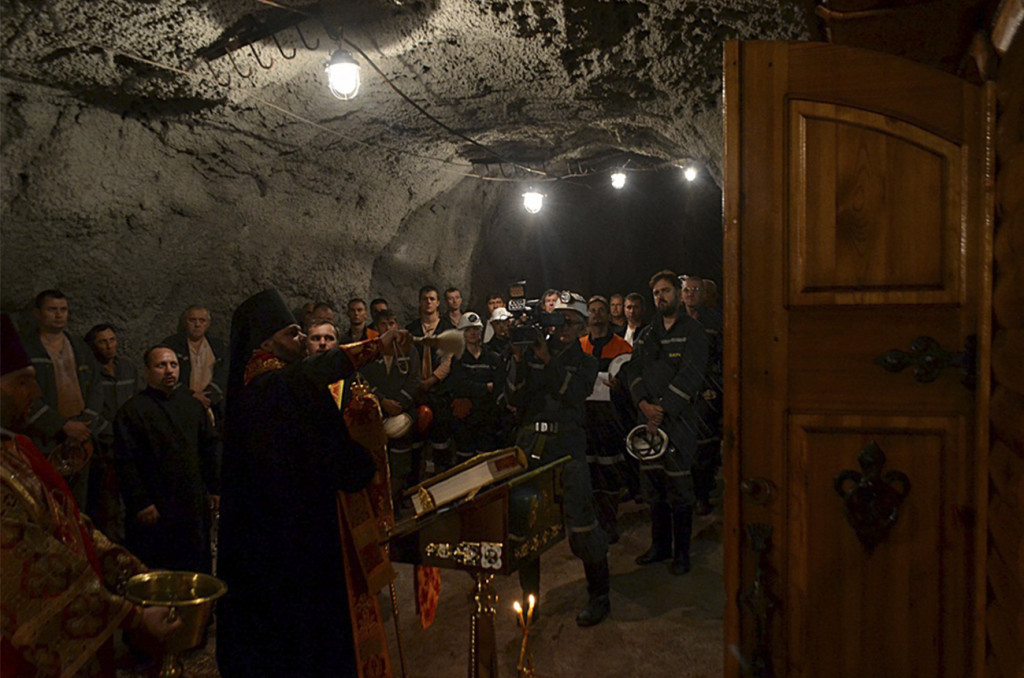 На фото освячення першої у світі каплиці, розташованої на глибині 840 метрів у шахті «Експлуатаційна» Запорізького залізорудного комбінату
