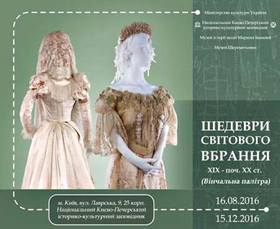 С 16 августа в выставочном зале Национального Киево-Печерского историко-культурного заповедника будет работать выставка «Шедевры мирового наряда XIX – начала ХХ века (Венчальная палитра)», сообщает Kplavra.kiev.ua.